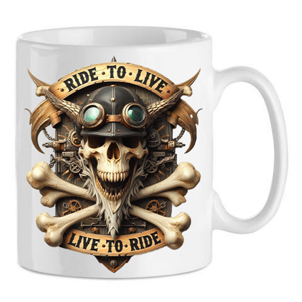 De afbeelding toont een imposante schedel die een vintage motorbril en leren cap draagt, omringd door elementen die doen denken aan een houten schild of embleem. Boven de schedel staat op een houten banner "RIDE TO LIVE", en onderaan, gekruist met twee forse botten, staat "LIVE TO RIDE". De schedel heeft een agressievere uitstraling met ontblote tanden, en aan weerszijden zijn vleugelachtige of hoornachtige structuren te zien, samen met industriële details zoals tandwielen en kettingen. Dit ontwerp combineert ruige biker-esthetiek met een steampunk-achtige flair en een gevoel van tijdloze avontuurlijkheid.