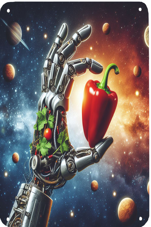 Stap in Technologie Ontmoet Natuur met deze intrigerende afbeelding! Een gedetailleerde, metallic robotarm strekt zich uit in een uitgestrekte kosmos, waarin de wonderen van technologie en natuur samenkomen. In de handpalm van de robotarm nestelt zich een perfecte, glanzende rode paprika, terwijl uit de mechanismen van de arm zelf frisgroene bladeren en een rijpe cherrytomaat ontspruiten. De achtergrond toont een betoverende sterrenhemel met zwevende planeten, wat een gevoel van innovatie, duurzaamheid en een grenzeloze toekomst van voeding oproept. Deze afbeelding is ideaal om de geavanceerde aard van uw producten of de vooruitstrevende visie van uw bedrijf te benadrukken, waarbij kwaliteit en innovatie hand in hand gaan