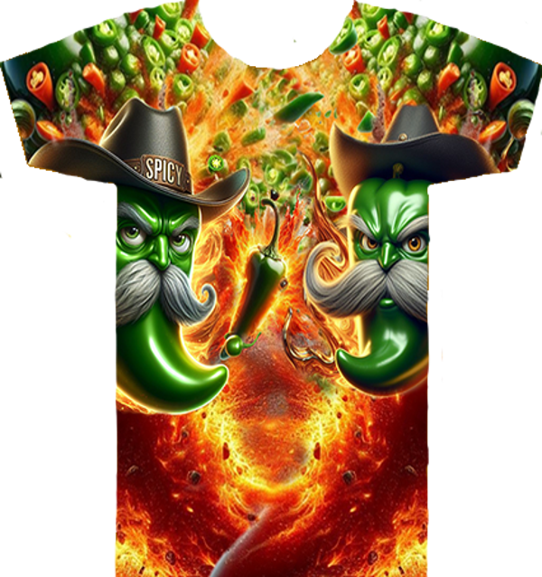 Spicy Brothers Chili Sleutelhanger - De Groene Cowboys - Geef je sleutelbos een stoere en pittige update met deze unieke 'Spicy Brothers Chili' sleutelhanger! De hanger, in de herkenbare vorm van een mini T-shirt, toont twee imposante groene chilipepers met een robuuste uitstraling. Beide pepers dragen een cowboyhoed – eentje met het label "SPICY" – en hebben een stijlvolle grijze snor en priemende ogen, wat ze een onmiskenbare 'cowboy'-look geeft. Tussen hen in zweeft nog een groene chili, en de hele scène wordt omlijst door een achtergrond van vlammen en explosies aan de onderkant, en een wat meer gematigde mix van gesneden pepers aan de bovenkant. Deze compacte en stevige sleutelhanger, bevestigd aan een robuuste ring, is perfect voor liefhebbers van pittig eten, western-stijl, of als een origineel en krachtig cadeau voor de 'spicy' persoon in je leven!