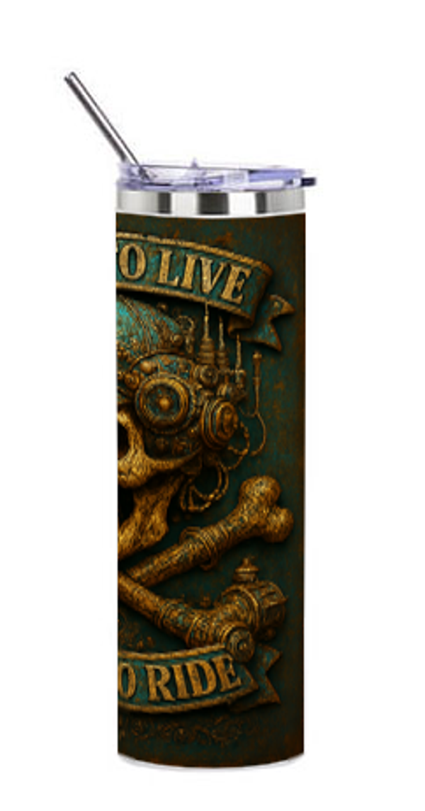 Laat je liefde voor het motorrijden zien met deze unieke, verouderde look! Deze afbeelding toont een gedetailleerde schedel in een rijke gouden tint, getooid met een stoere pet in een prachtige turquoise patina afwerking, versierd met steampunk-achtige elementen. Onder de schedel kruisen twee botten die naadloos opgaan in het geheel. Boven en onder de centrale afbeelding prijkt de iconische spreuk 'RIDE TO LIVE - LIVE TO RIDE' op bijpassende patinabanden. De diepe, donkergroene achtergrond met subtiele textuur geeft het geheel een authentieke, vintage uitstraling. Een absolute must-have voor de motorliefhebber met oog voor detail!